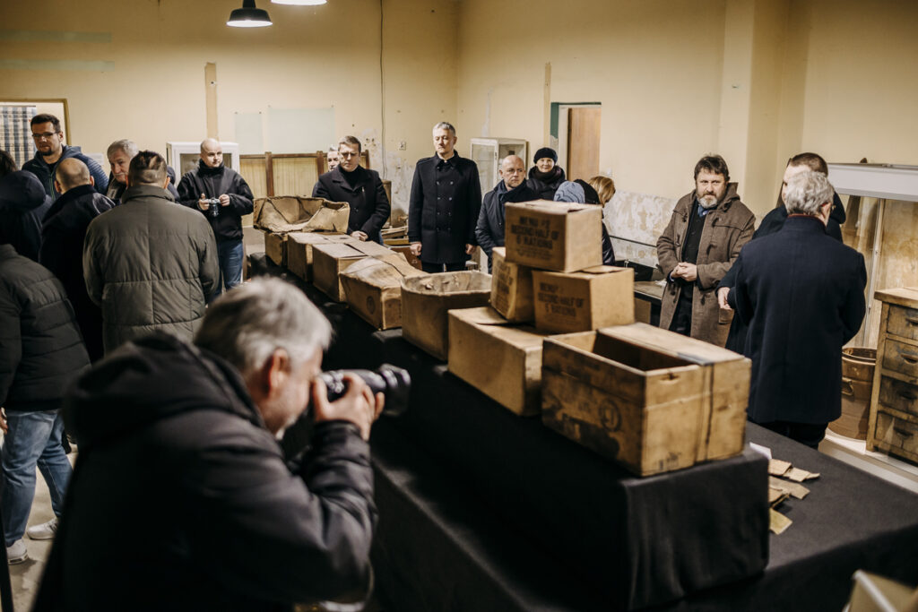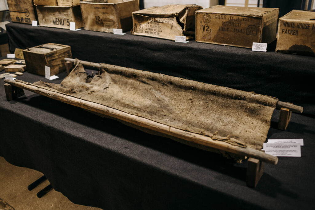 Na dzisiejszej wystawie pokazaliśmy oryginalne prowizoryczne nosze wykonane z jutowego worka rozciętego po szwach i dwóch drewnianych drążków, które zrobiono w jednym z okolicznych gospodarstw by wynosić z baraków chorych więźniów i tych nie mających siły się poruszać. Są to także oryginalne metalowe puszki, skrzynki i kartony z amerykańskich wojskowych racji żywnościowych oraz lekarstwa. Żywność i lekarstwa pochodzą ze Stanów Zjednoczonych z wysyłanego zaopatrzenia na potrzeby wojenne dla Rosjan tzw. Lend Lease i do Auschwitz, a raczej już do wyzwolonego Oświęcimia dotarły wraz z żołnierzami z frontu Ukraińskiego, którzy wyzwolili kompleks obozu KL Auschwitz od Niemców. Przedmioty z wystawy pochodzą z przełomu lat 1944 i 1945, a w Oświęcimiu były w użyciu praktycznie od 27 stycznia 1945 do jesieni 1945, kiedy ostatni byli więźniowie opuścili szpitale PCK, ale pomoc dla byłych więźniów trwała nadal i była także dalej wspomagana już przez amerykańską UNRA, którą dysponowały także Oświęcimskie punkty PUR ( Państwowy Urząd Repatriacyjny funkcjonujące do 1951 roku) była to także żywność, leki ale również i ubrania.